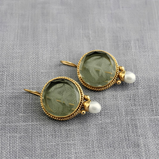 Noa – Pendientes Vintage con Piedra Verde Redonda y Perlas