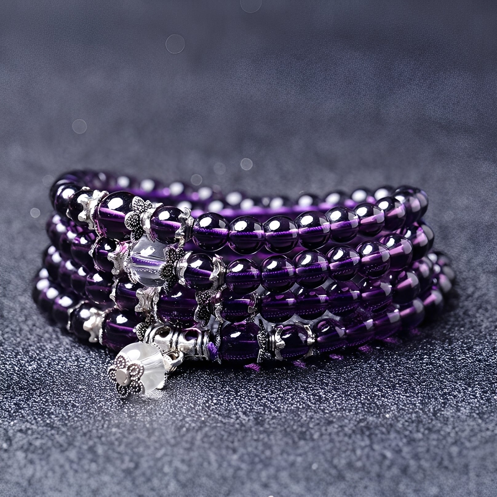 Con Mia, descubre una pulsera y collar espiritual compuesto por 108 cuentas de ametista. Utilizado como mala budista, favorece la meditación, la serenidad y el equilibrio interior. Versátil y elegante, se puede llevar como pulsera o collar según tus deseos. Una joya espiritual que combina belleza y bienestar en el día a día.