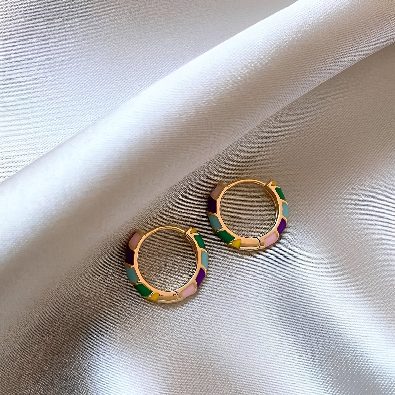 Sofia cautiva con su diseño elegante y detalles en esmalte multicolor sobre un acabado dorado radiante. Cada pendiente está cuidadosamente elaborado para reflejar luz, color y personalidad. Ideales para añadir un toque artístico y sofisticado a cualquier look, son perfectos tanto para el día a día como para eventos especiales. Ligeros y cómodos, se adaptan a tu estilo con gracia. Una joya vibrante que celebra la creatividad y la elegancia.