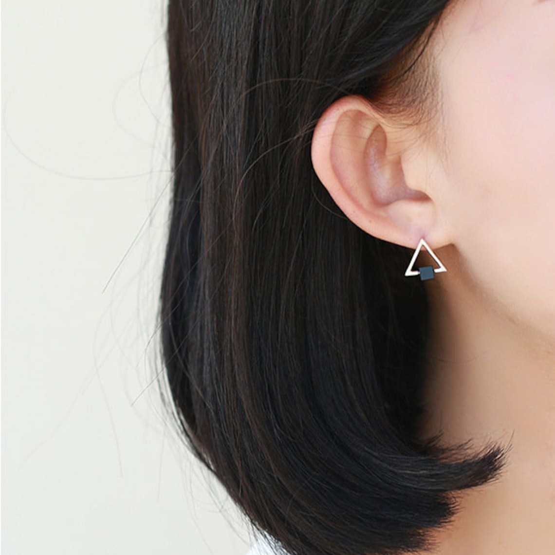 Experimenta la sofisticación moderna con nuestros pendientes geométricos de triángulo y cubos negros.