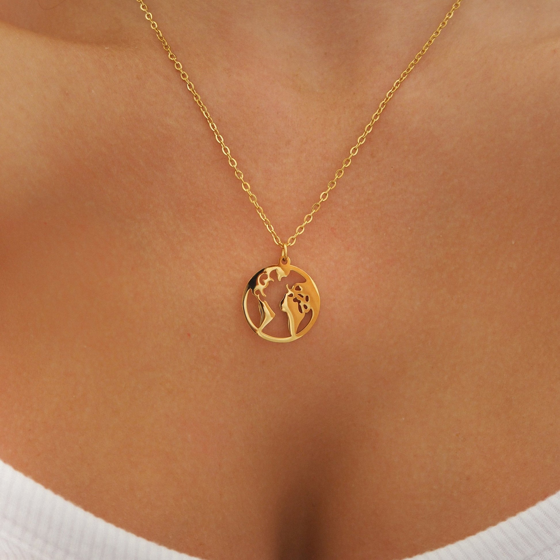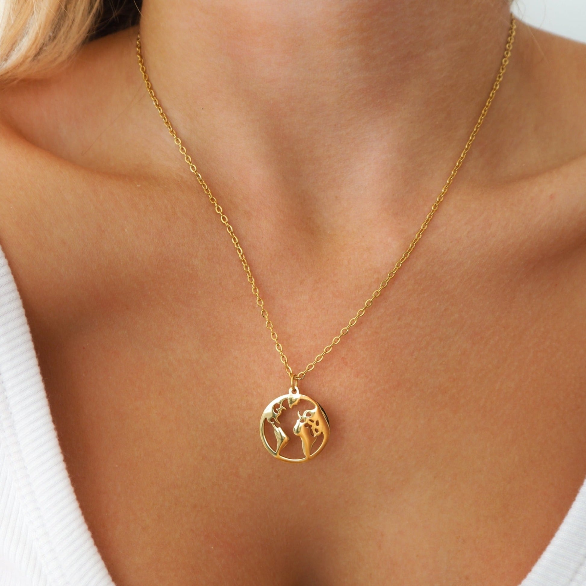 Yumi resalta un collar delicado con un colgante en forma de mapa del mundo en oro, diseñado para aportar un toque refinado y elegante a tu look. Su diseño limpio y atemporal recuerda el amor por los viajes y la aventura, al mismo tiempo que ofrece una sofisticación discreta. El colgante detalla cuidadosamente cada continente, un homenaje sutil a la belleza del mundo. Este collar es ideal para acompañar tanto un atuendo casual como uno más formal. Viaje y elegancia se encuentran en esta joya preciosa, perfecta para los aventureros en busca de un accesorio único.